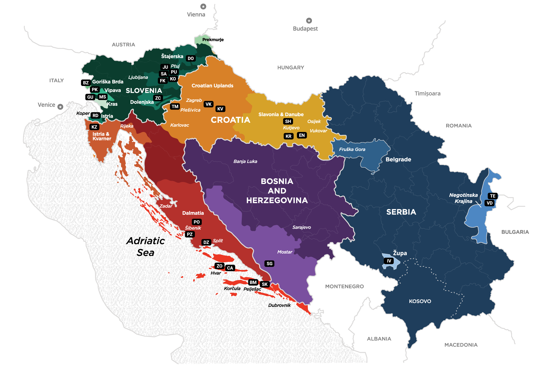 Central Europe, Southeastern Europe, the Balkans, ex-Yugoslavia - however one chooses to refer to this area - it is an encaptivating and pivotal part of Europe with a culturally diverse history, dramatic landscapes, eclectic cuisines, and rich winemaking traditions. Situated right in the center of Europe, between the Alps, the Adriatic Sea and the Pannonian Plains, this entire region (approximately the size of Virginia) possesses a wildly unique variety of microclimates, soils and indigenous grapes. Our mission is to explore the culmination of all these attributes in bottle form.